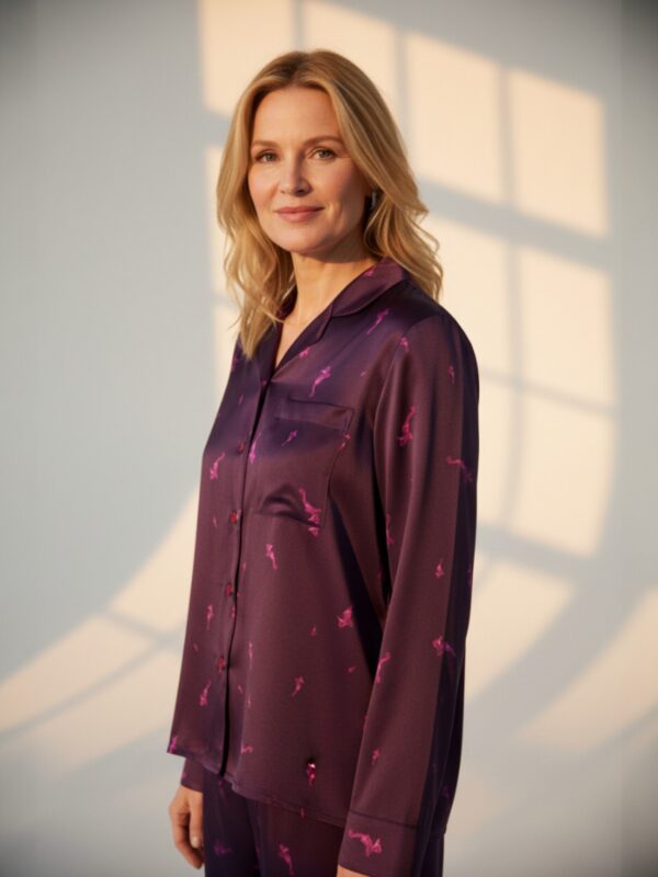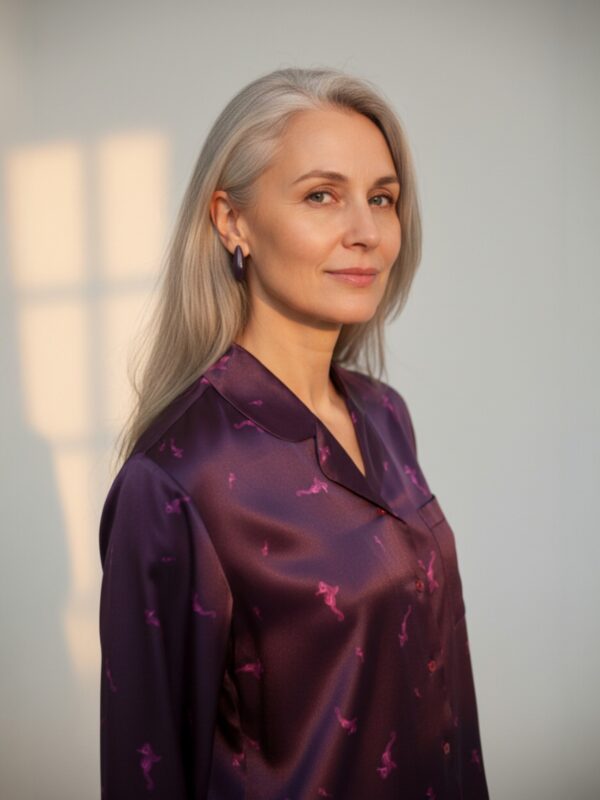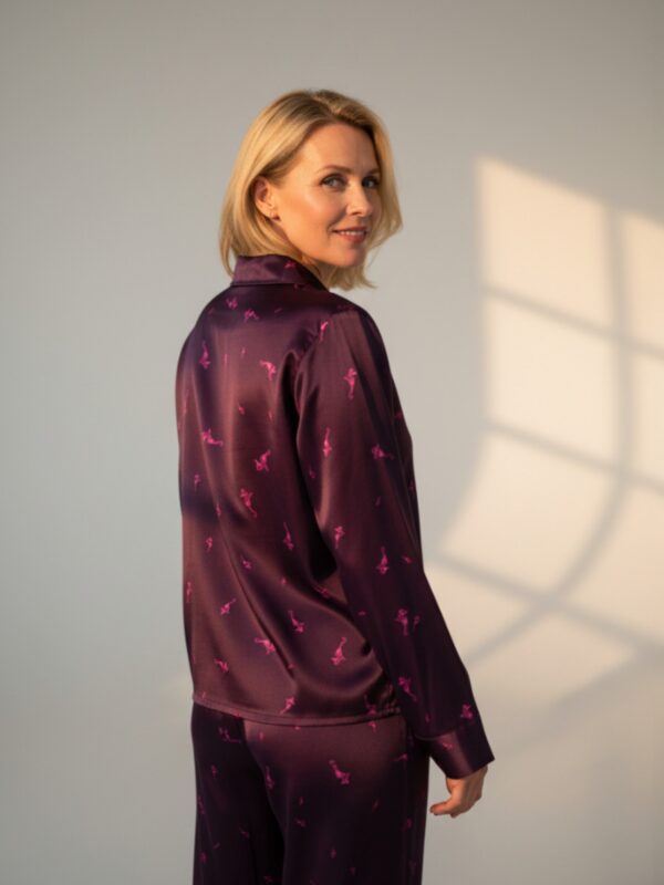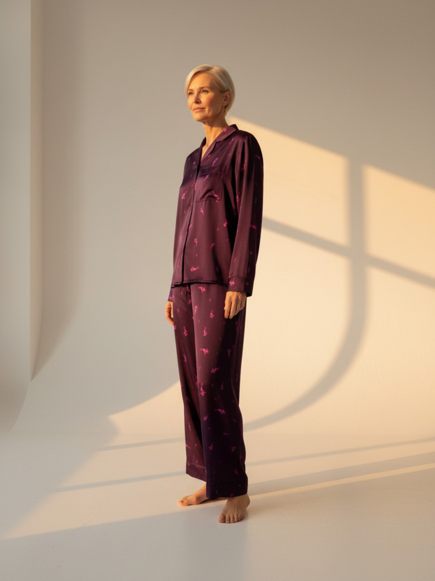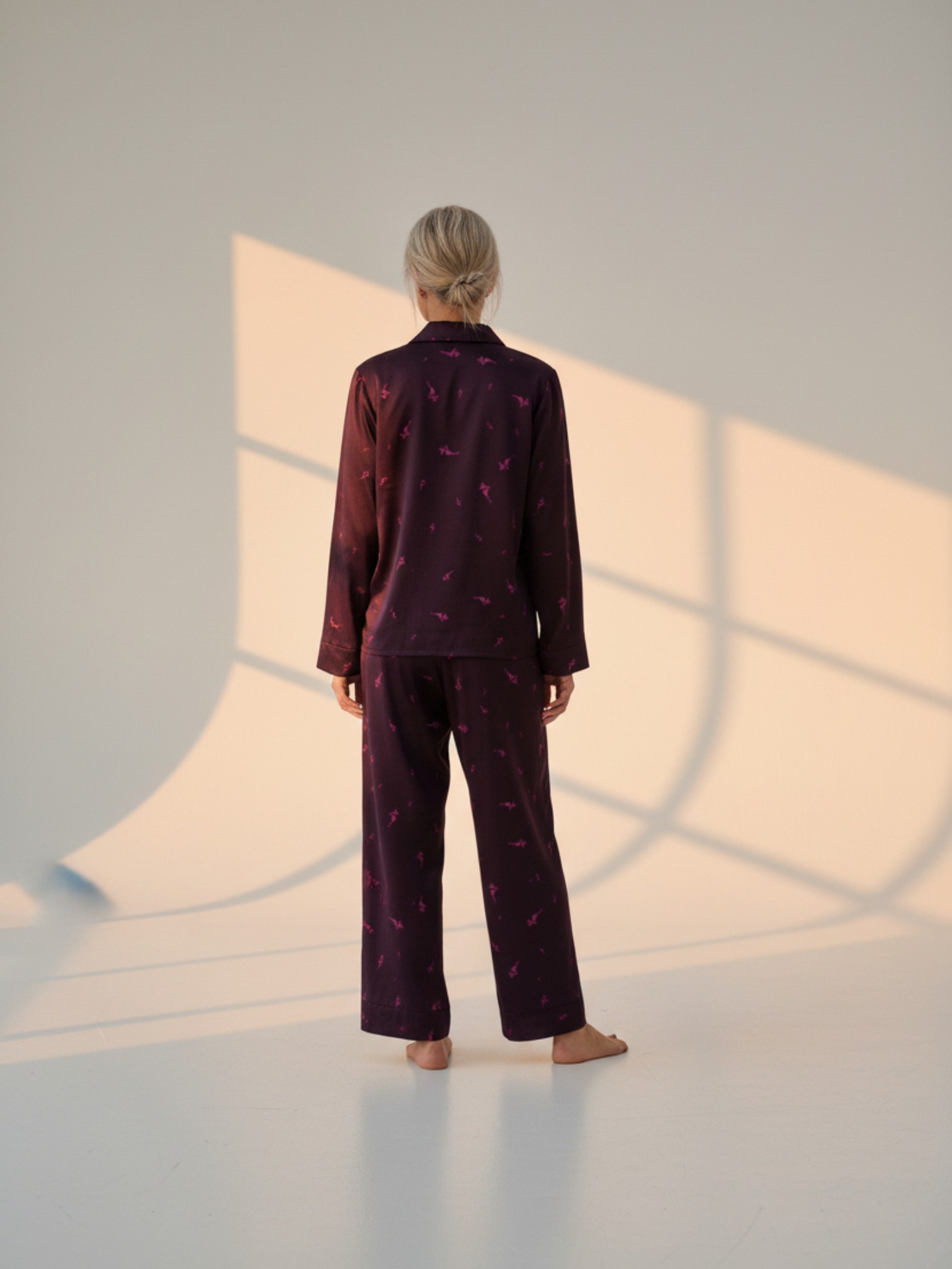 Tanel Veenre’s “Soul Creature” silk satin pajamas – adorned with crowned winged seahorses – are perfect for both the bedroom and the theatre. Made from luxurious 22-momme silk satin, the pajamas are elegant enough to wear as part of a formal outfit, while offering extraordinary softness and breathability against the skin in the bedroom. The fabric’s natural sheen and gentle drape give it a timeless style.