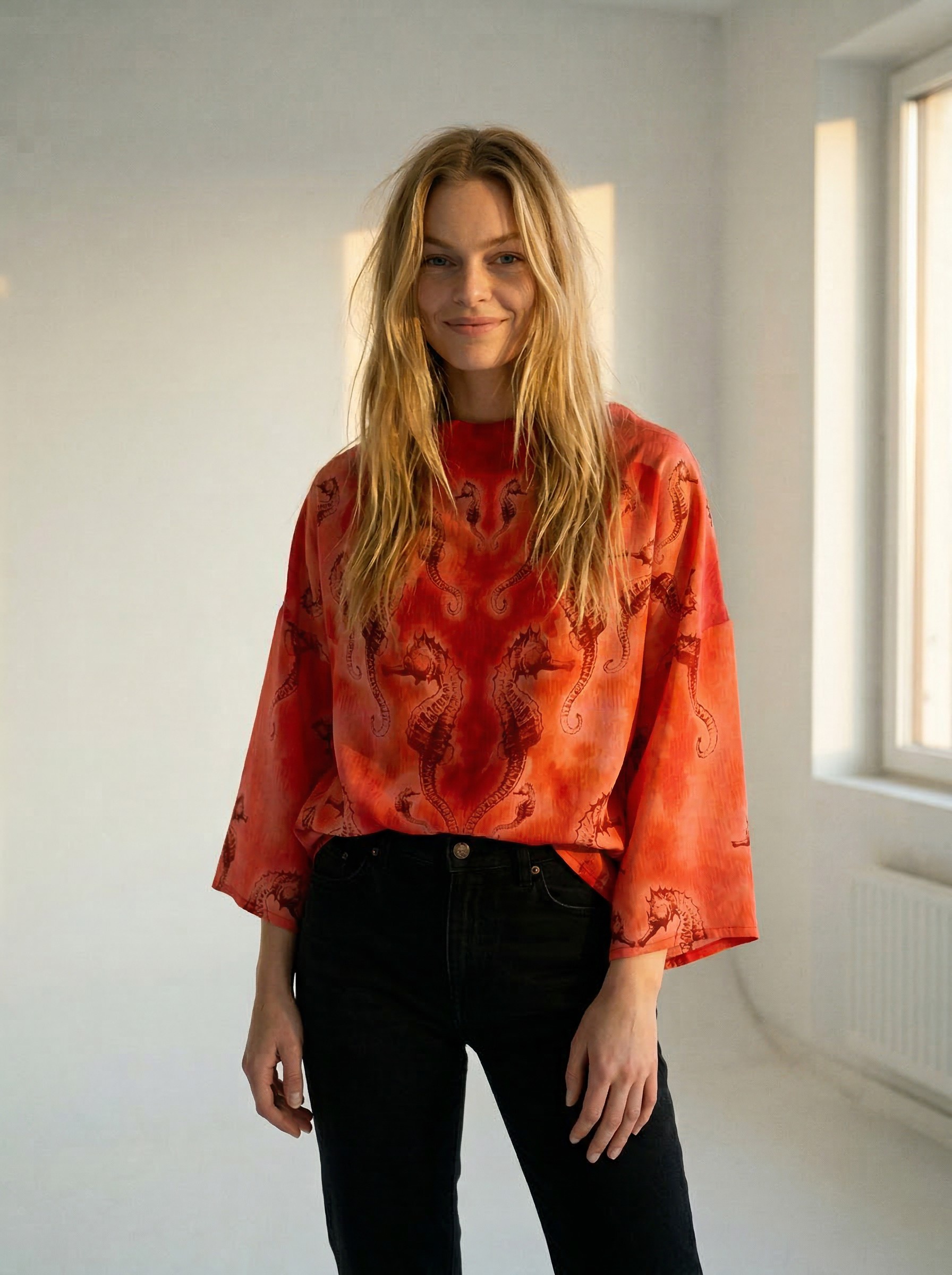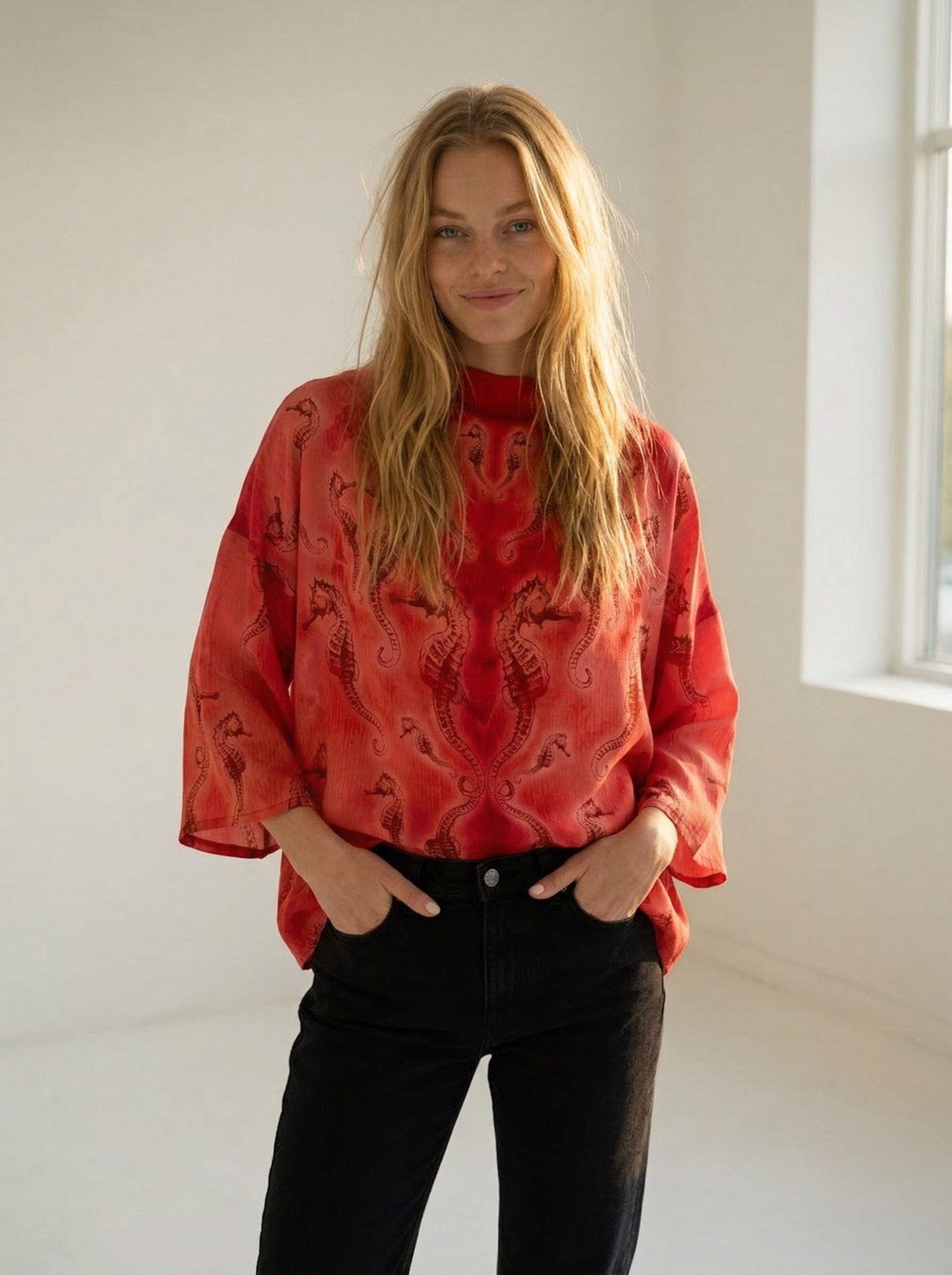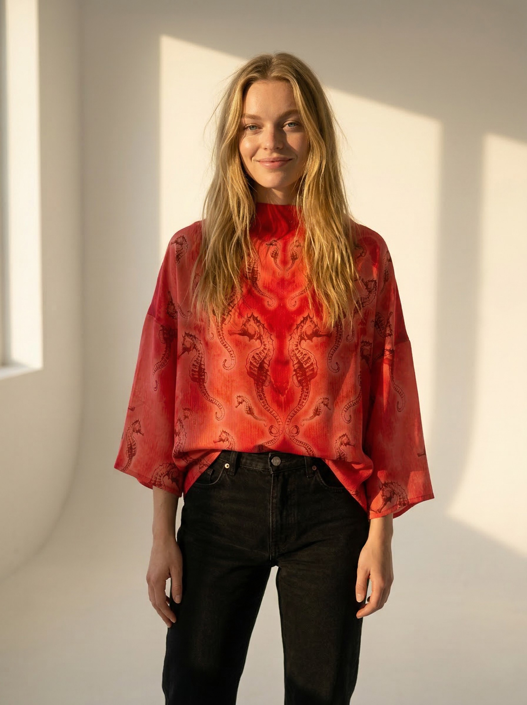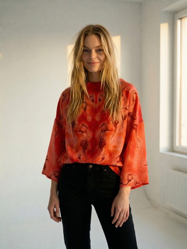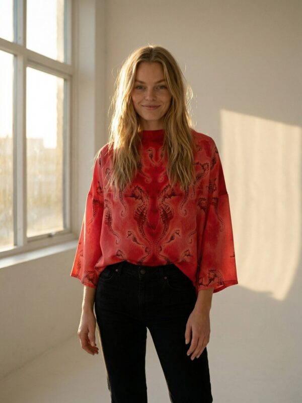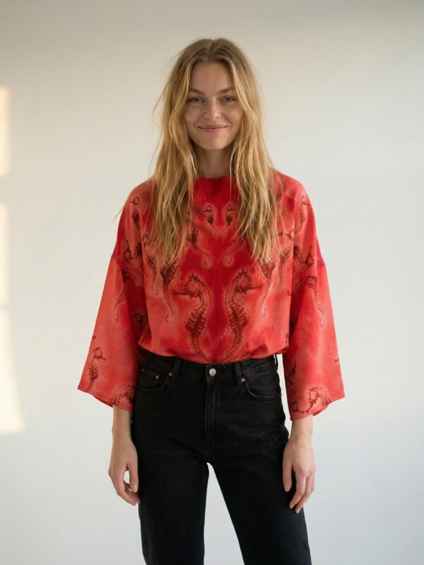 Mõnus avara lõikega Tanel Veenre trükimustrilisest siidist topp – sobib nii lemmikpükste kui ka seeliku peale. Samuti on see ideaalne rannas päevitusriiete peale visata. Naturaalne ja hingav kvaliteetne siid tagab kandjale mugava ja kerge enesetunde. Sobib unikaalsust hindavale kliendile – igast tootest on maailmas vaid üks eksemplar 🙂