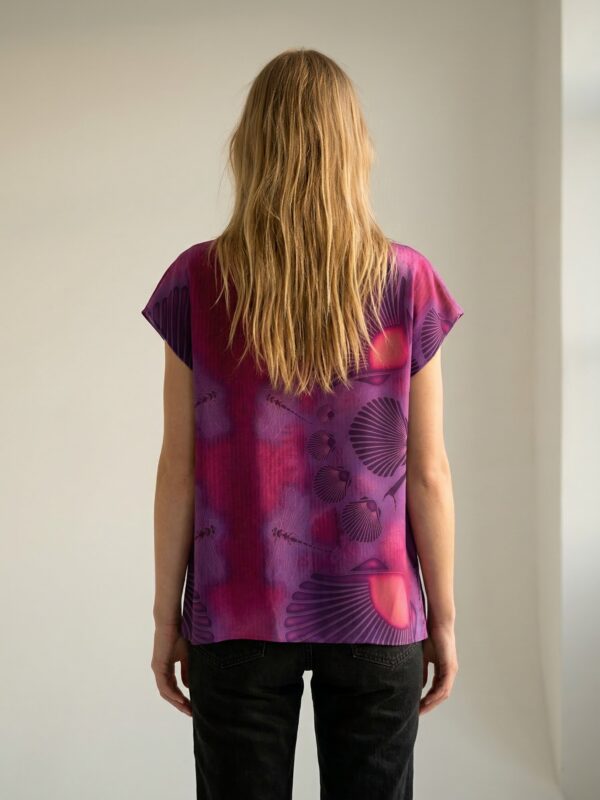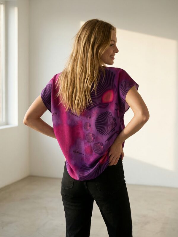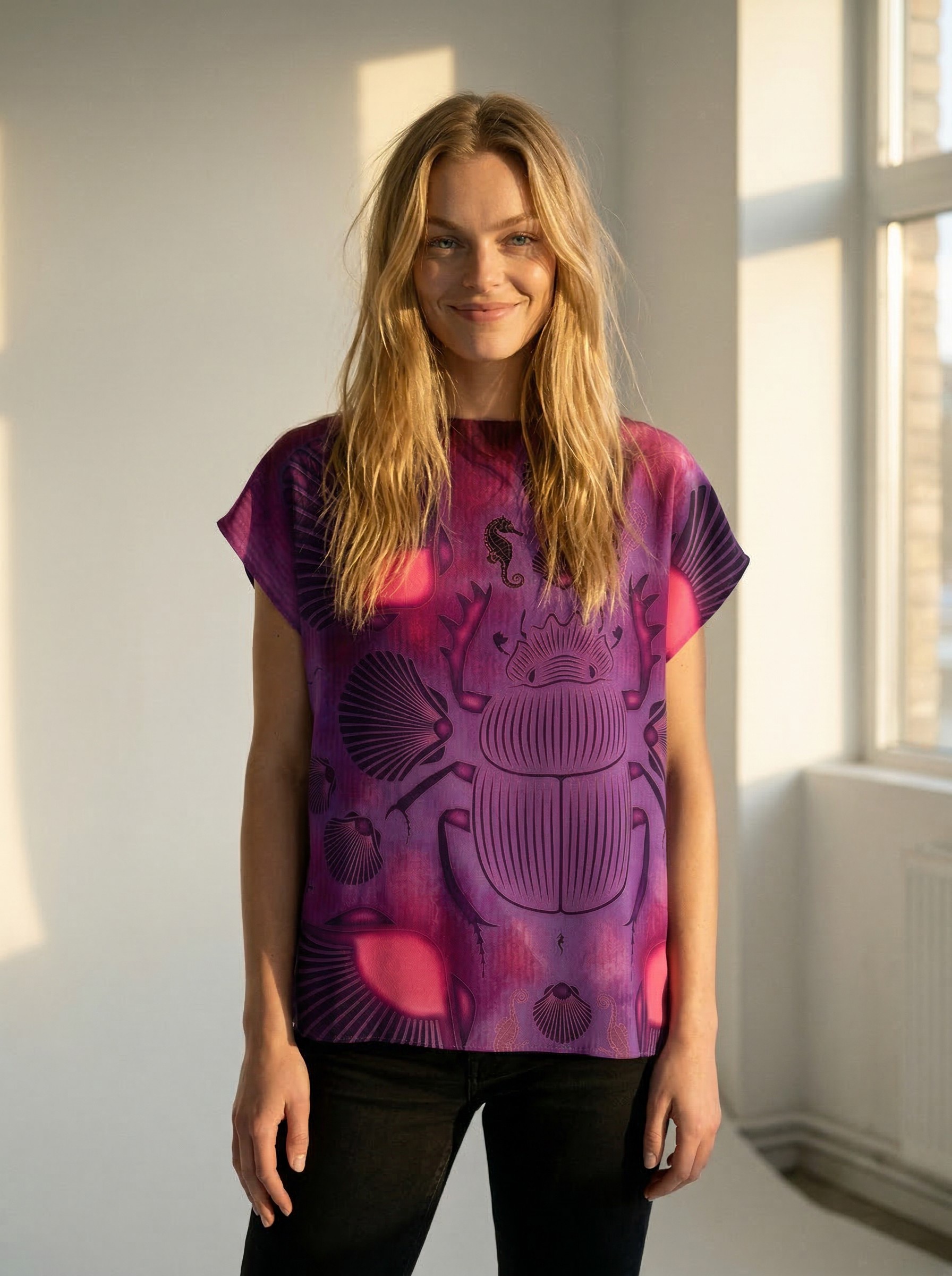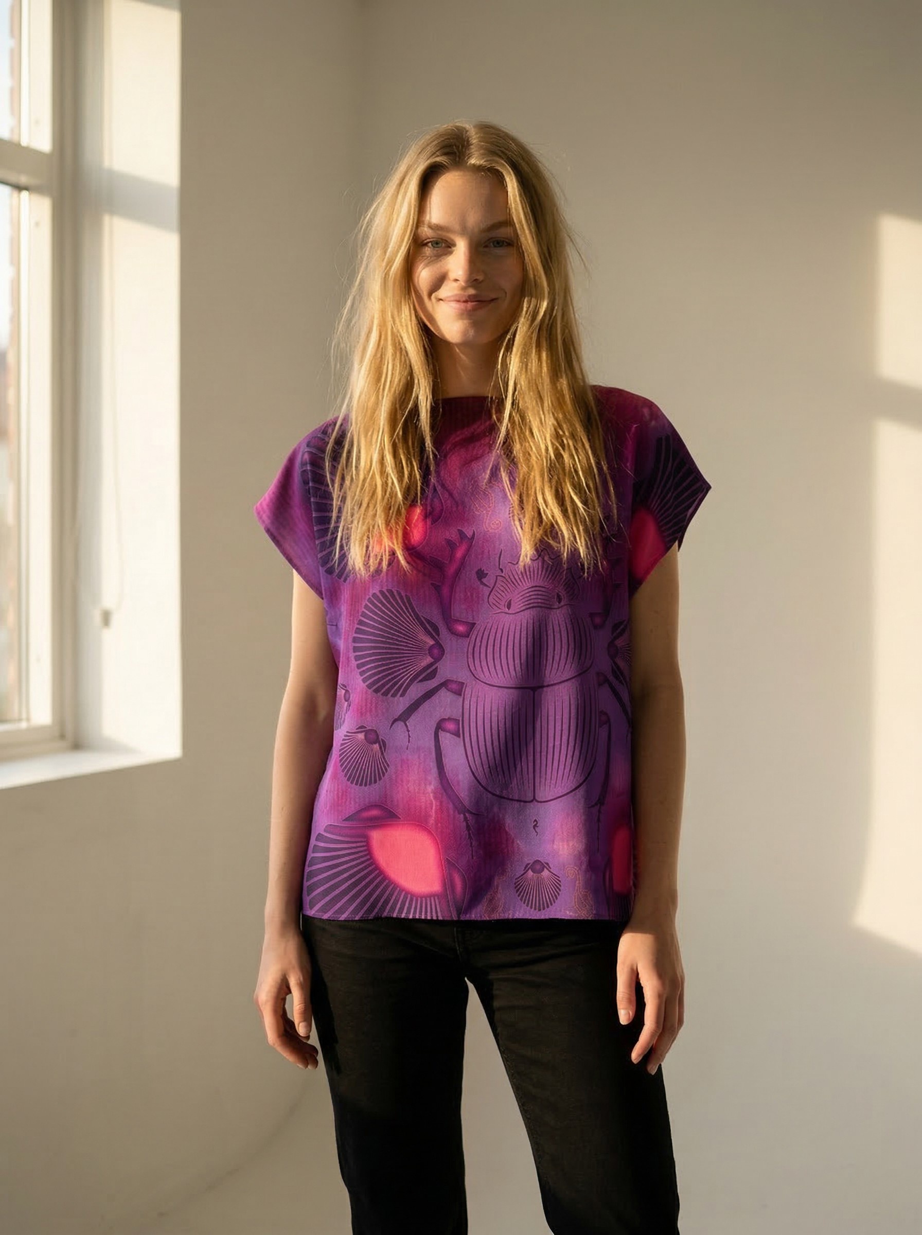 Mõnus avara lõikega Tanel Veenre trükimustrilisest siidist topp – sobib nii lemmikpükste kui ka seeliku peale. Samuti on see ideaalne rannas päevitusriiete peale visata. Naturaalne ja hingav kvaliteetne siid tagab kandjale mugava ja kerge enesetunde. Sobib unikaalsust hindavale kliendile – igast tootest on maailmas vaid üks eksemplar 🙂