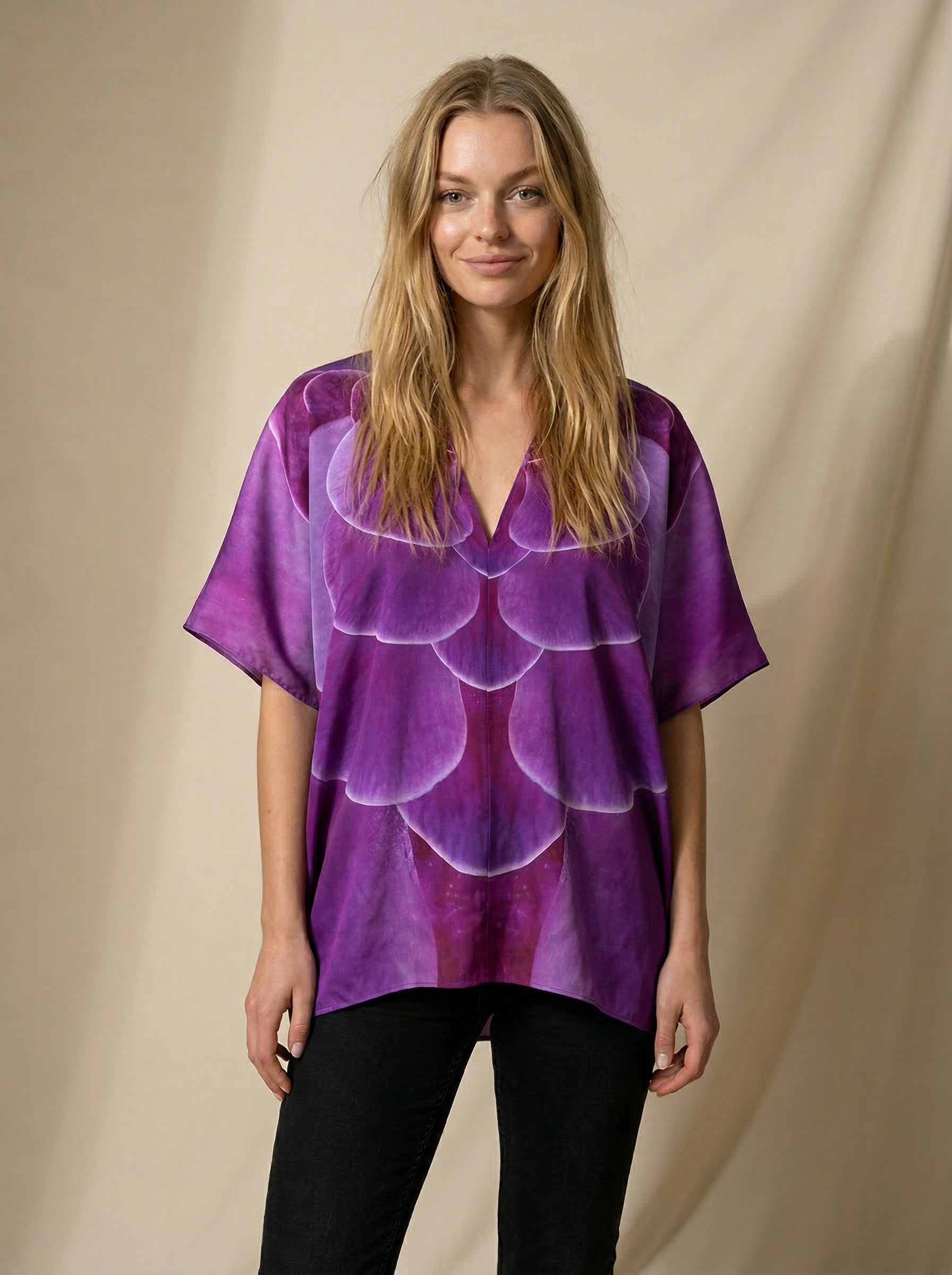 Mõnus avara lõikega Tanel Veenre trükimustrilisest siidist topp – sobib nii lemmikpükste kui ka seeliku peale. Samuti on see ideaalne rannas päevitusriiete peale visata. Naturaalne ja hingav kvaliteetne siid tagab kandjale mugava ja kerge enesetunde. Sobib unikaalsust hindavale kliendile – igast tootest on maailmas vaid üks eksemplar 🙂