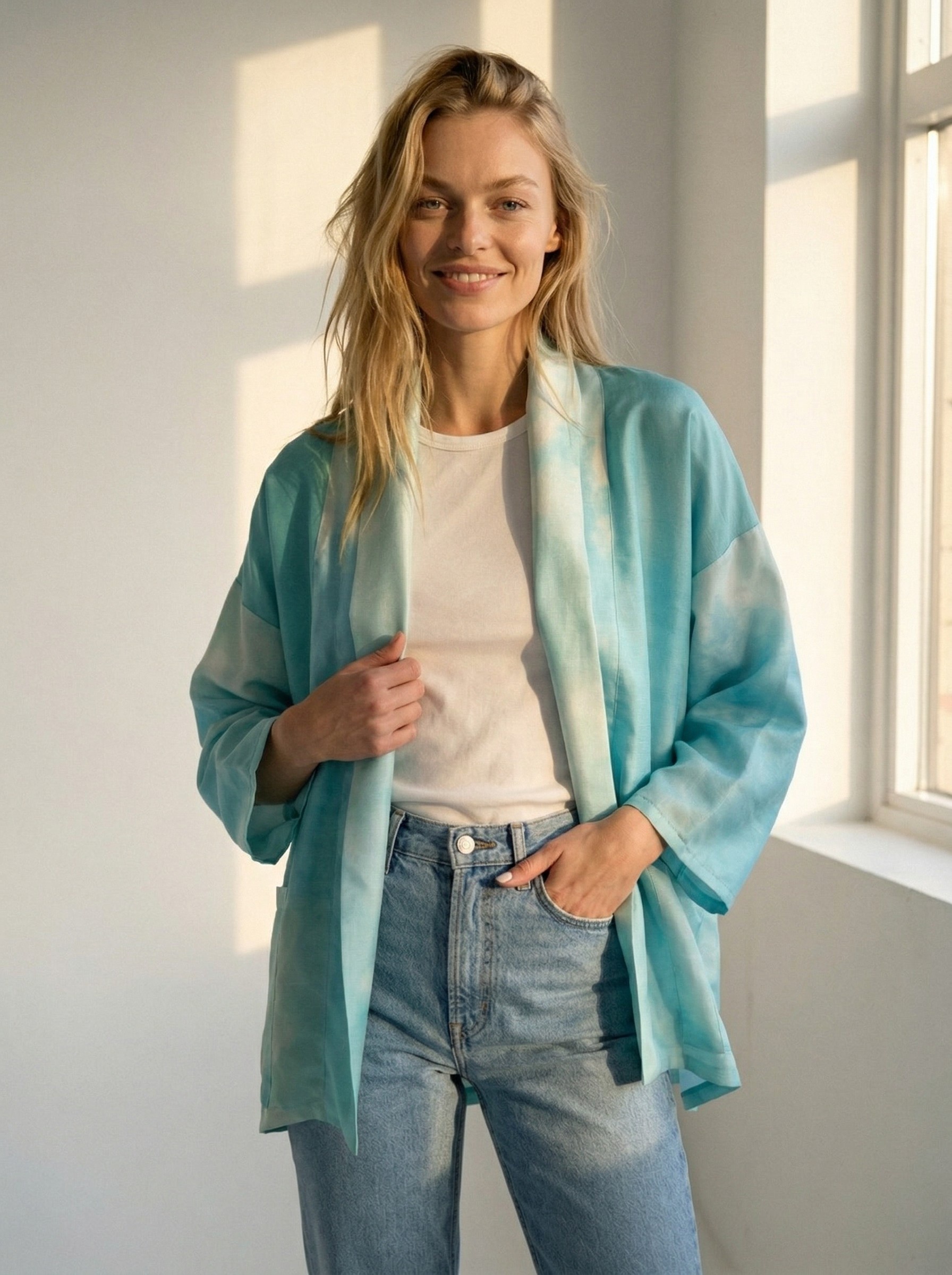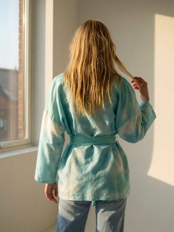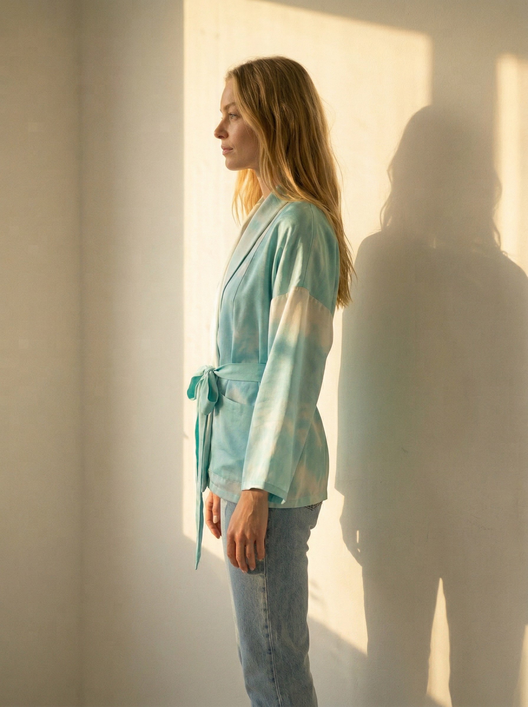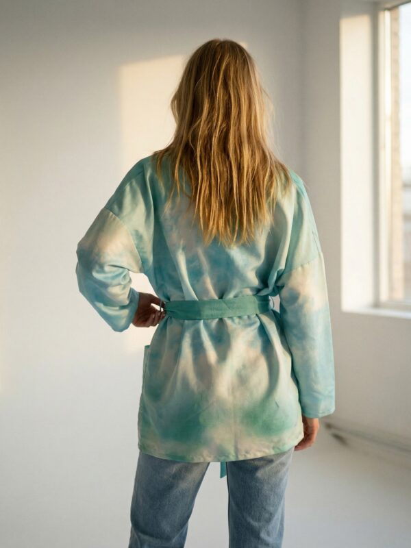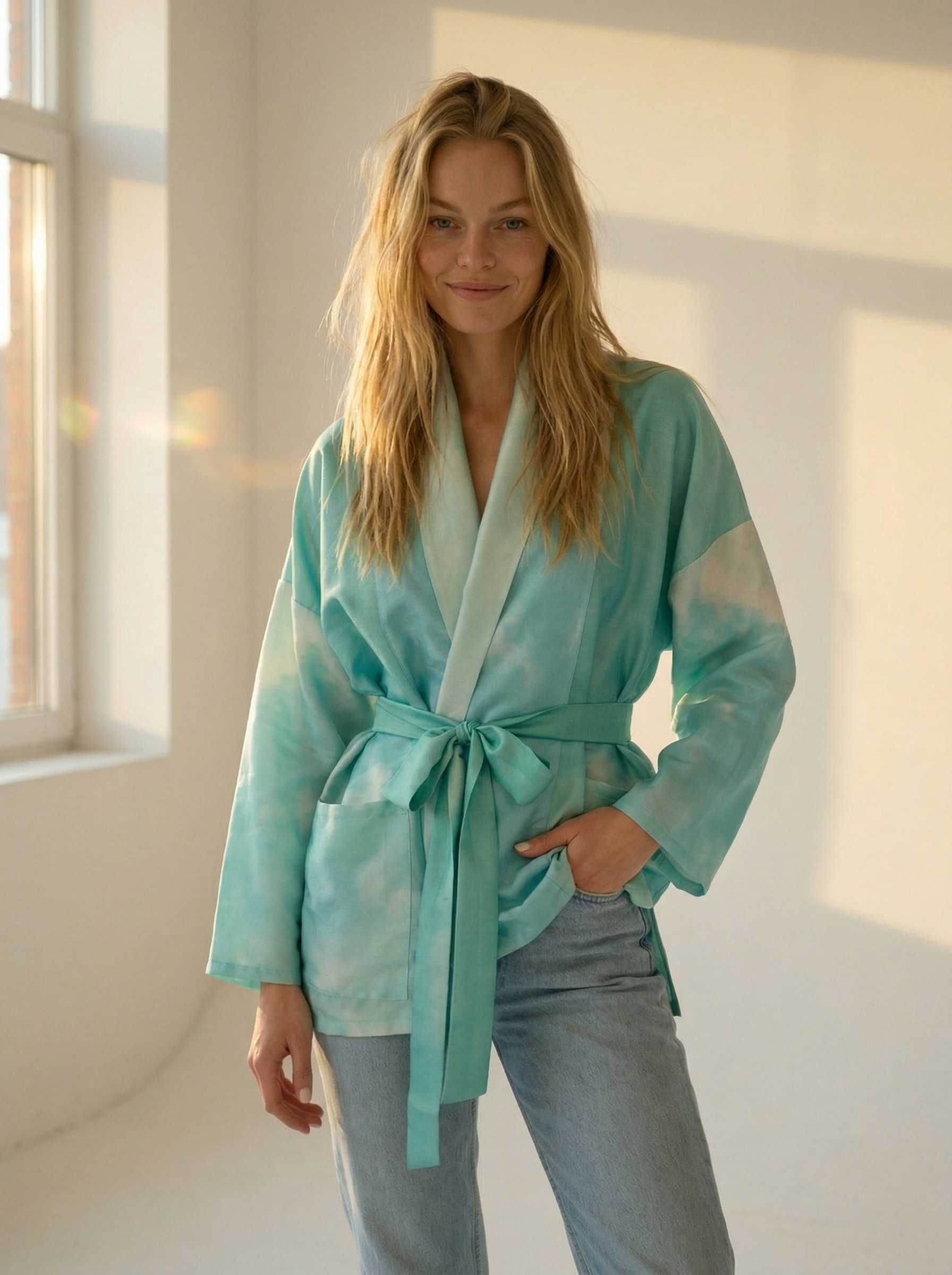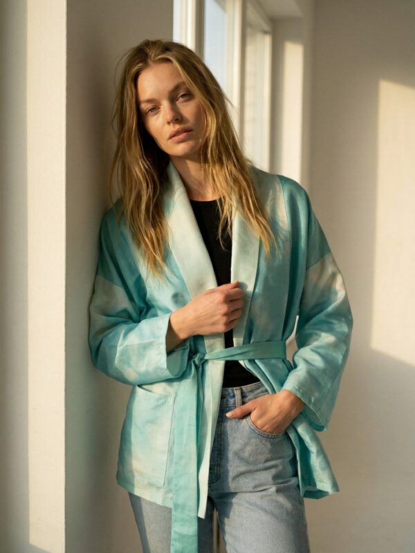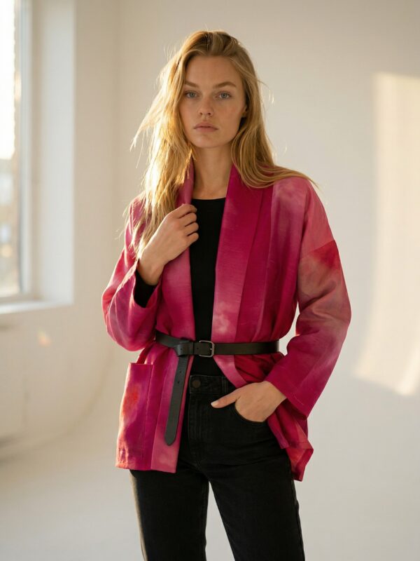 Avara ja lihtsa lõikega jakk pakub maksimaalset mugavust igale kehatüübile. See on ülimugav (me ju armastame taskuid ja avarust!) üleriie, mis muudab iga looki efektseks ja pidulikuks – proovi seda oma lemmikpükste ja topiga või hoopis lihtsalõikelise kleidi peal. Avatud hõlmadega annab jakk vaba ja boheemliku puudutuse, komplekti kuuluva siidist vööga kinniseotuna aga rõhutab taljet.