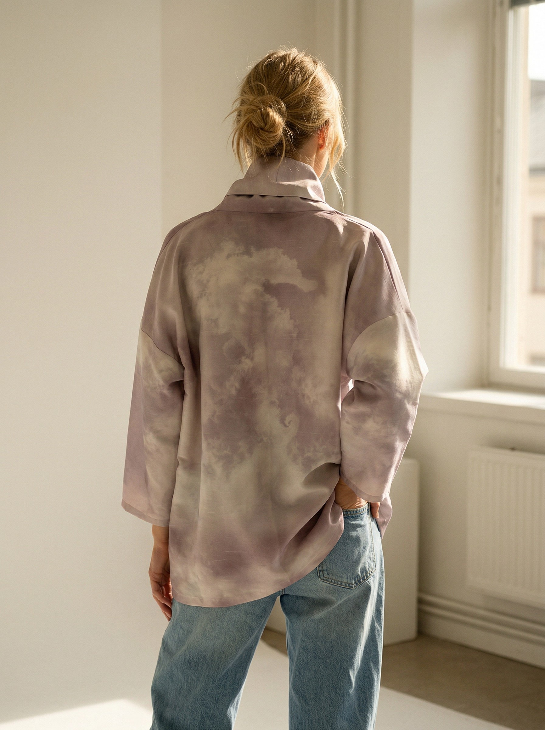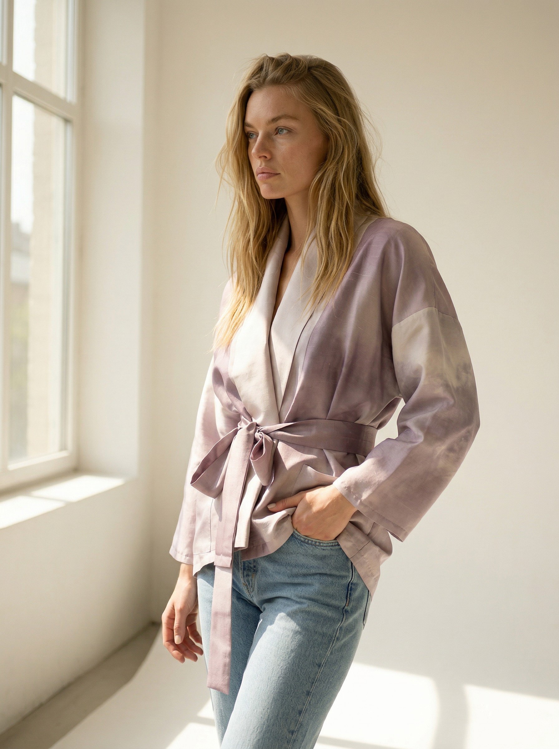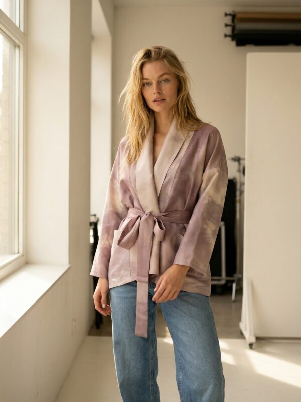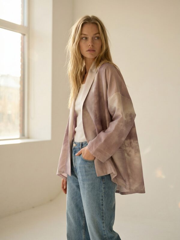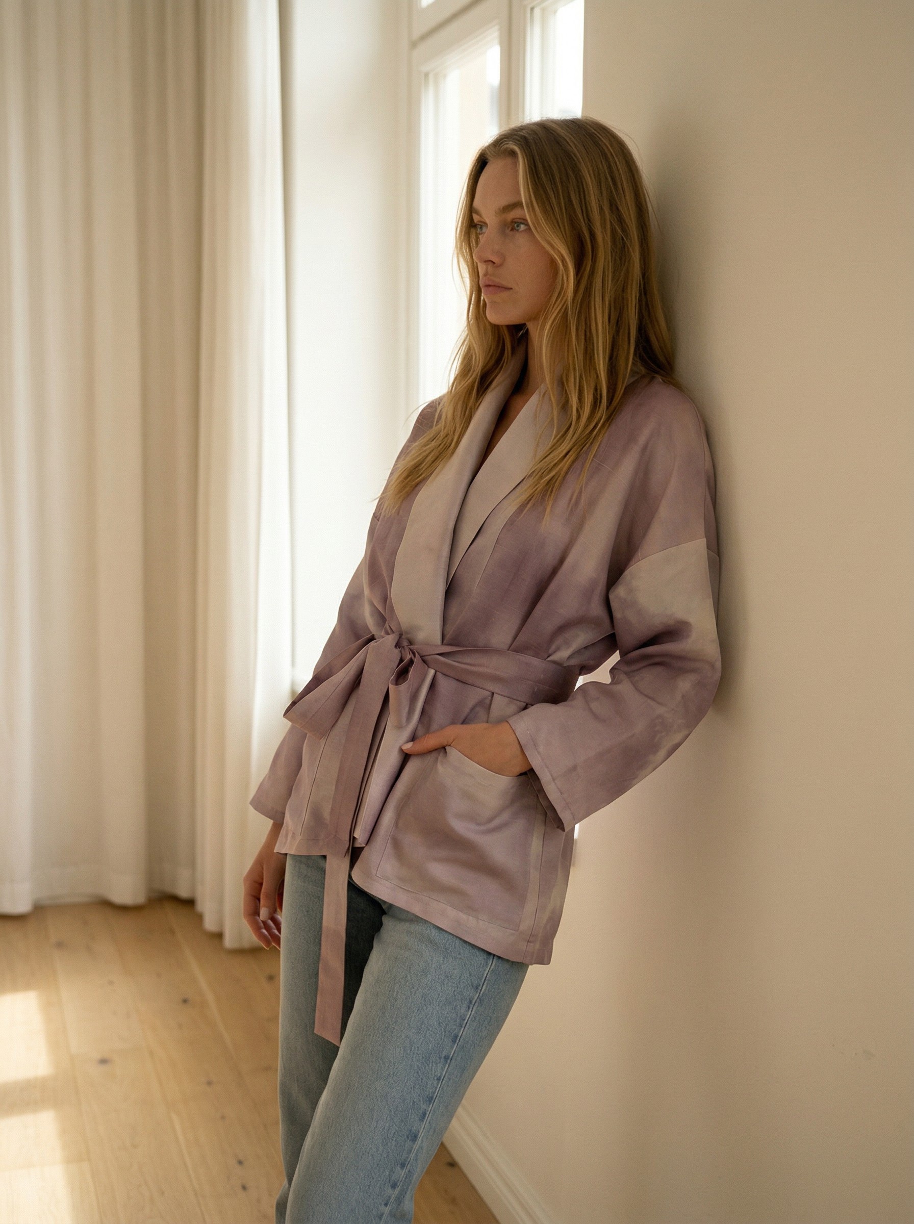 Avara ja lihtsa lõikega jakk pakub maksimaalset mugavust igale kehatüübile. See on ülimugav (me ju armastame taskuid ja avarust!) üleriie, mis muudab iga looki efektseks ja pidulikuks – proovi seda oma lemmikpükste ja topiga või hoopis lihtsalõikelise kleidi peal. Avatud hõlmadega annab jakk vaba ja boheemliku puudutuse, komplekti kuuluva siidist vööga kinniseotuna aga rõhutab taljet.