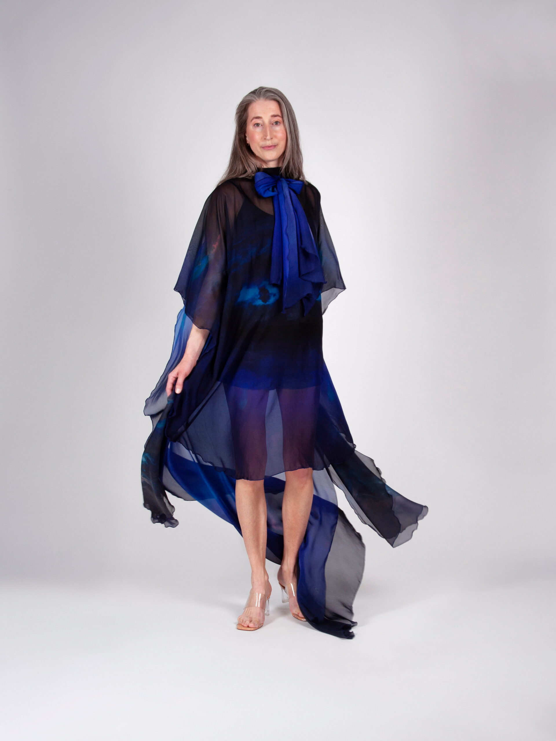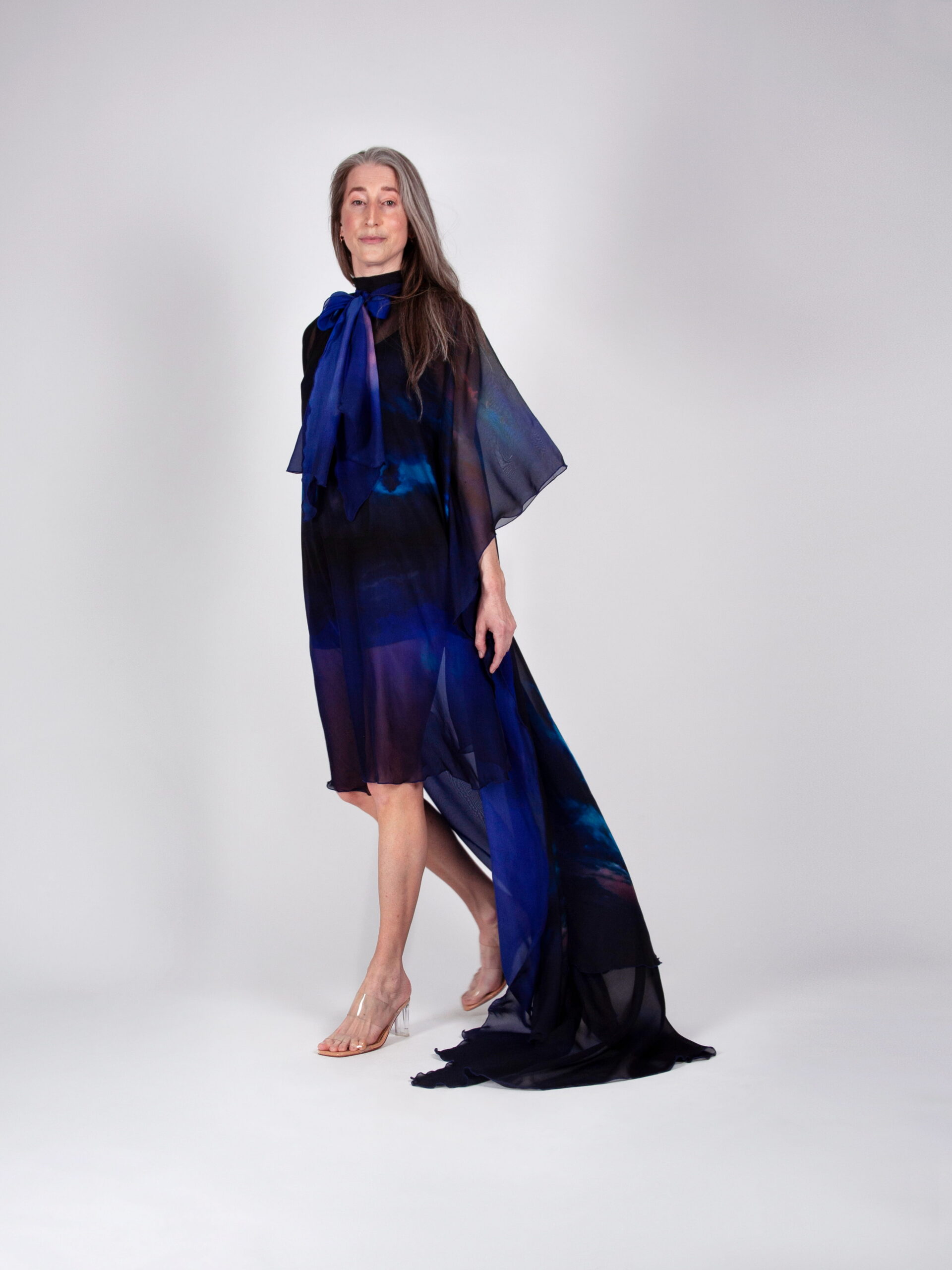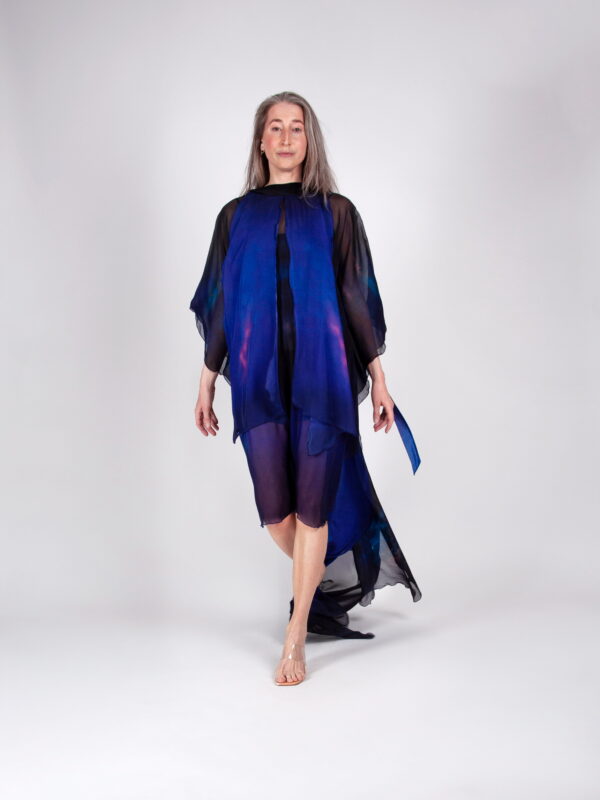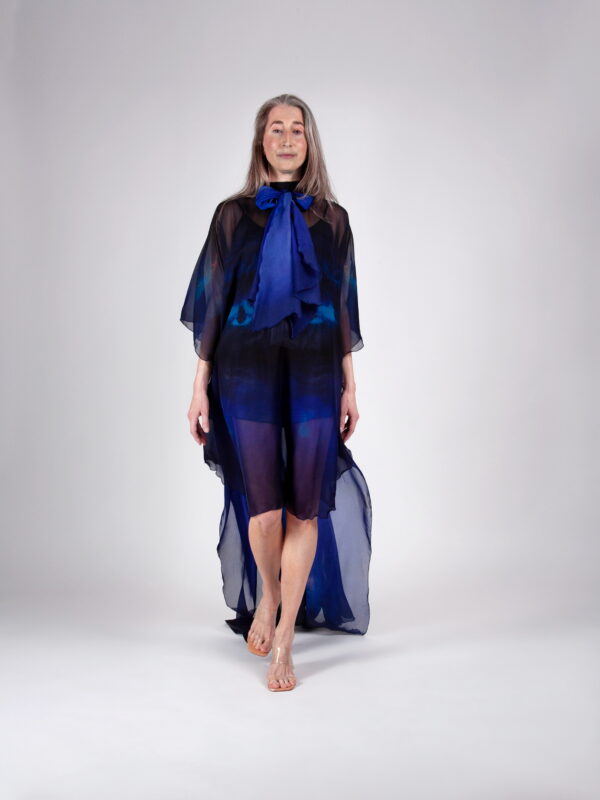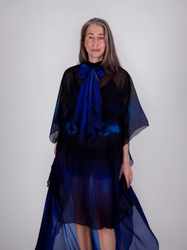 Kihiline ja hõljuvalt kerge siidšifoonist kleit, mille esiosa on lühem ning tagant langeb elegantne pikk vedik. Kleit on kaetud üleni Tanel Veenre unikaalse fotoprindiga. Avar lõige sobib erinevatele kehatüüpidele ning pakub rohkelt kandmisvõimalusi – all võid valida kas lihtsa aluskleidi või kombineerida lihtsalt selga käivat avarat kleiti hoopis topi ja pükstega.